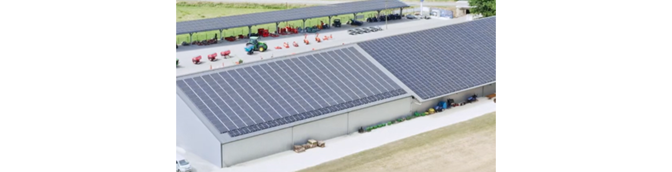 Installation de panneaux photovoltaïques, dédiés à un nouveau bâtiment de stockage pour l’établissement spécialisé dans la revente et réparation de matériel agricole, espace vert.
