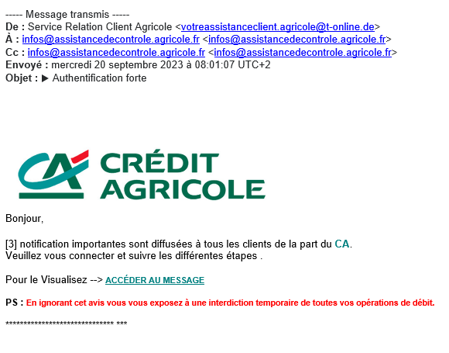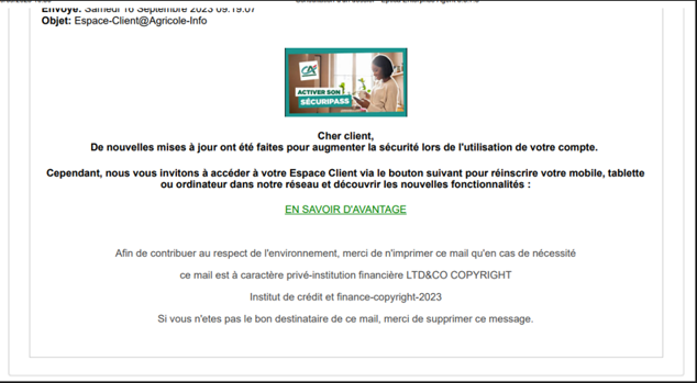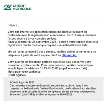 Des mails de phishing visant les clients du Crédit Agricole sont en permanence diffusés massivement. Ils s’appuient sur des sujets d’actualité du Groupe, et demandent en général de façon pressante, de confirmer ou mettre à jour ses données pour des raisons techniques ou pour un nouveau service par exemple.