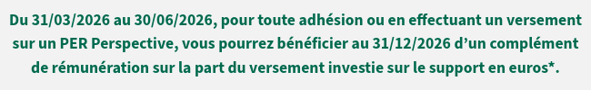 * La rémunération nette de frais de gestion attribuée à la part investie sur le support en euros des versements (hors versements par transfert) nets de frais effectués entre le 31 mars et le 30 juin 2026, bénéficie d’un complément de rémunération. Le taux du complément de rémunération sera de 1% (taux annualisé, hors contributions sociales) et sera affecté au support en euros de votre adhésion. Ce bonus est attribué au 31/12/2026 pour la période s’étendant de la date de capitalisation du versement jusqu’au 31 décembre 2026 selon les modalités d’attribution de la participation aux bénéfices décrites dans vos documents contractuels. La date retenue pour l’éligibilité du versement à ce complément de rémunération est la date de signature de la demande d’adhésion pour le versement initial, la date de signature de l’opération pour les versements libres, la date d'effet du versement pour les versements réguliers. En cas de désinvestissement total du support en euros avant le 01/01/2027, ce complément de rémunération ne sera pas attribué au 31/12/2026. En cas de désinvestissement partiel du support en euros, les capitaux bénéficiant de ce complément de rémunération sont diminués d’un montant égal au produit de ces capitaux par un coefficient. Ce coefficient est égal au rapport entre le montant désinvesti du support en euros et la valeur de rachat du support en euros à la date du désinvestissement.